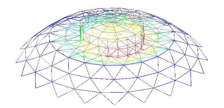 依据现场检测结果、原设计图纸,建立单层网壳整体模型,考虑恒载、活荷载、风荷载、水平和竖向地震作用下,对房屋主要构件进行承载力计算。