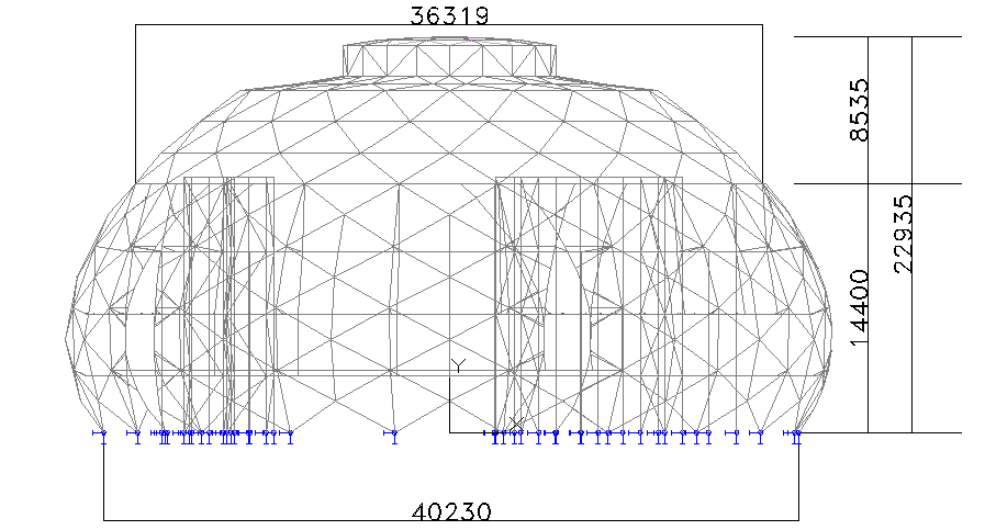 F区房屋为地下一层、地上单层网壳结构。建筑总体呈球形,房屋室内外高差为0.45m,总高度为23.935m。屋盖由顶部、肩部和底部三部分组成,屋盖底标高为14.4m,房屋平面呈圆形,在标高14.4m处(屋盖底)直径约为36.3m;在±0.00m处(房屋底)直径约为40.2m。